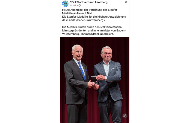 Unser Vorstandsmitglied Helmut Noë hat gestern Abend die Staufer-Medaille des Landes Baden-Württemberg erhalten. Wir gratulieren ganz herzlich.