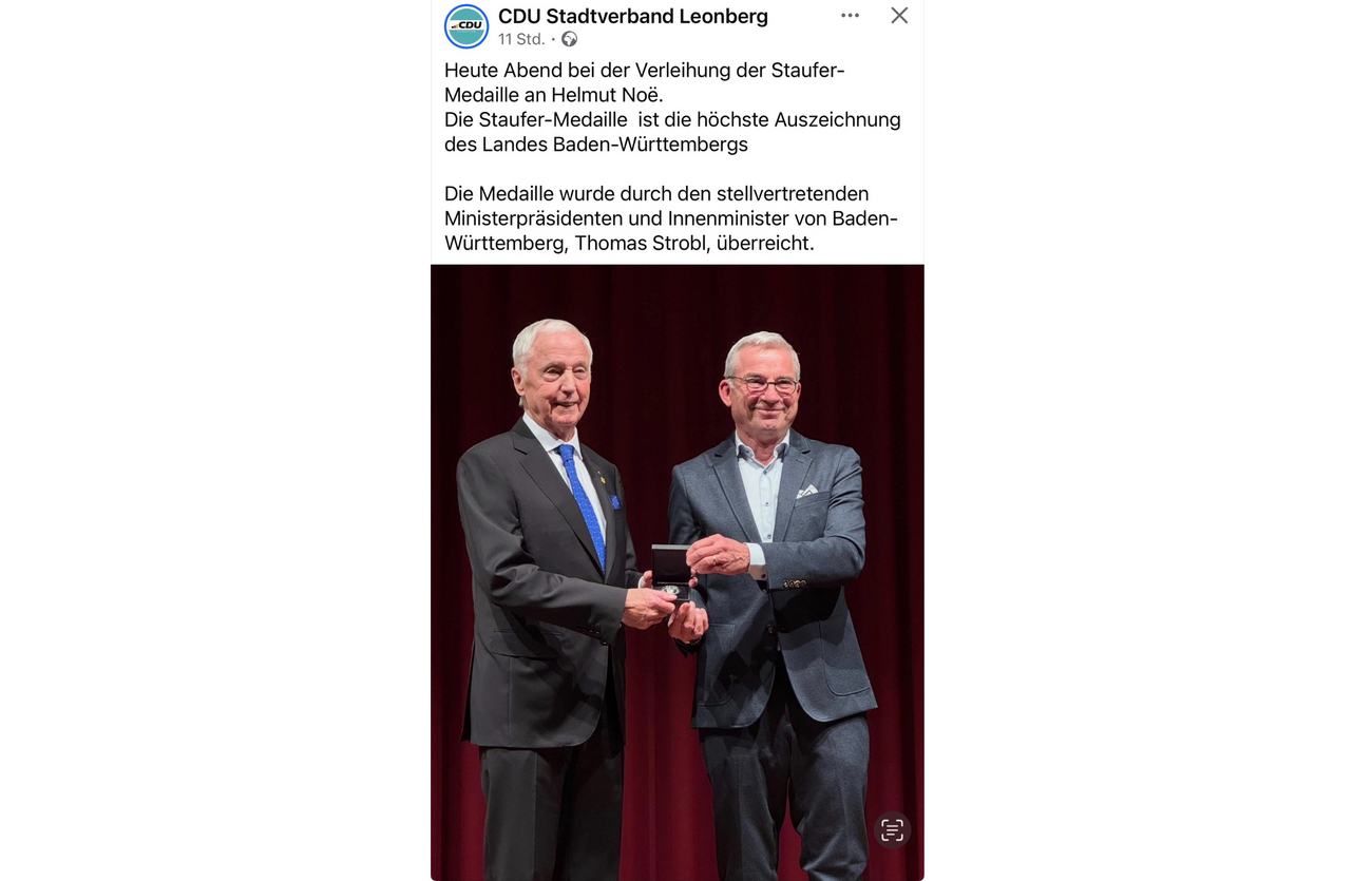 Unser Vorstandsmitglied Helmut Noë hat gestern Abend die Staufer-Medaille des Landes Baden-Württemberg erhalten.