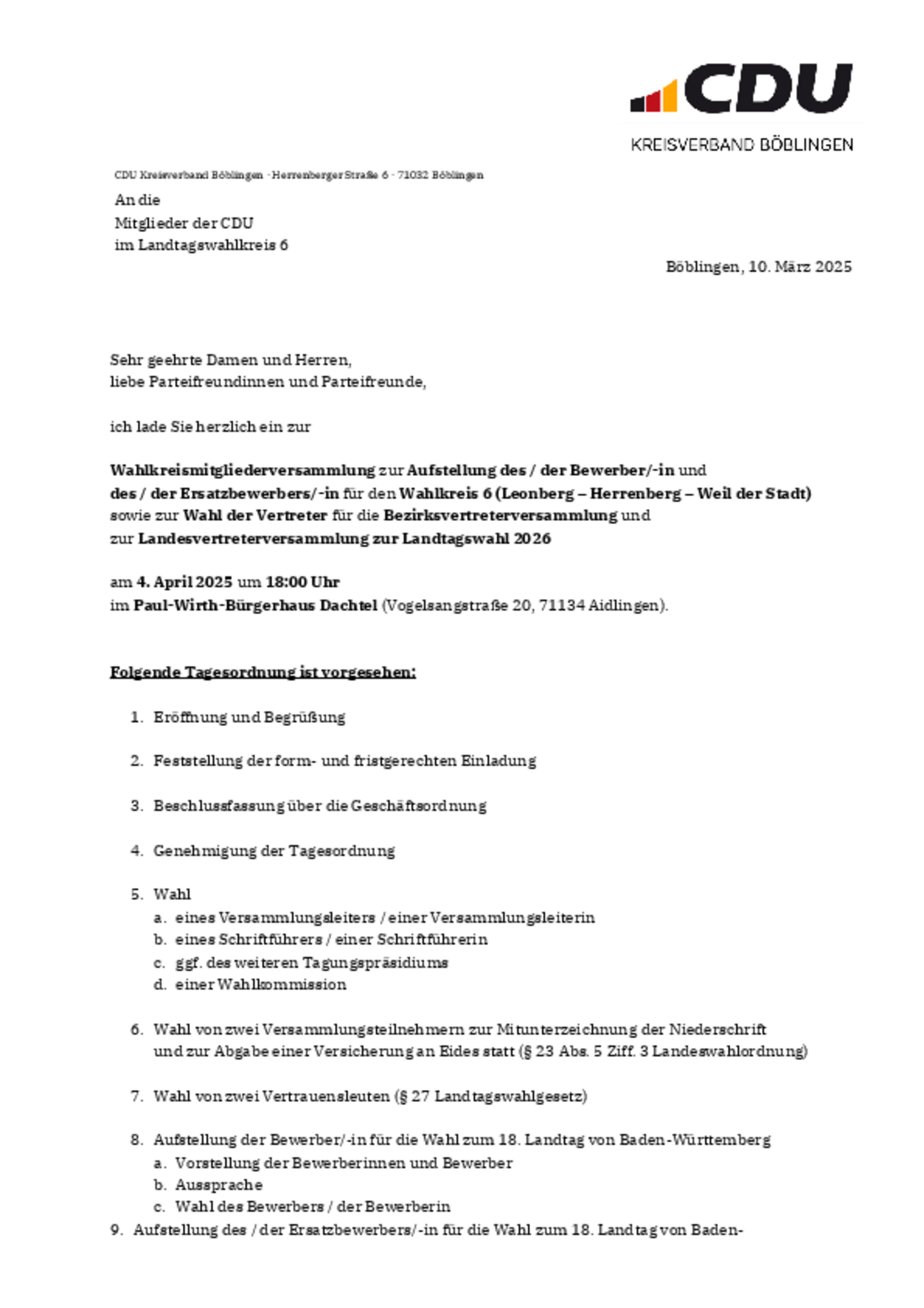 Herzliche Einladung an alle Einwohner des Wahlkreises 6 zur Nominierungsversammlung am 4. April um 18.00 h in Aidlingen-Dachtel im Paul-Wirth-Bürgerhaus